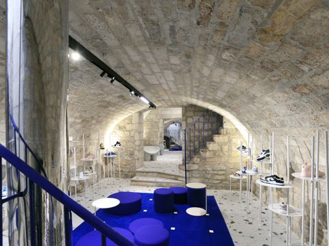 El diseño mezcla elementos clásicos, como el sótano abovedado de paredes de piedra, con el estilo vanguardista de las sillas de diseño y las propias zapatillas. En definitiva, es un ejemplo de cómo Stracciatella-R Nacar combina con todo tipo de estilos.